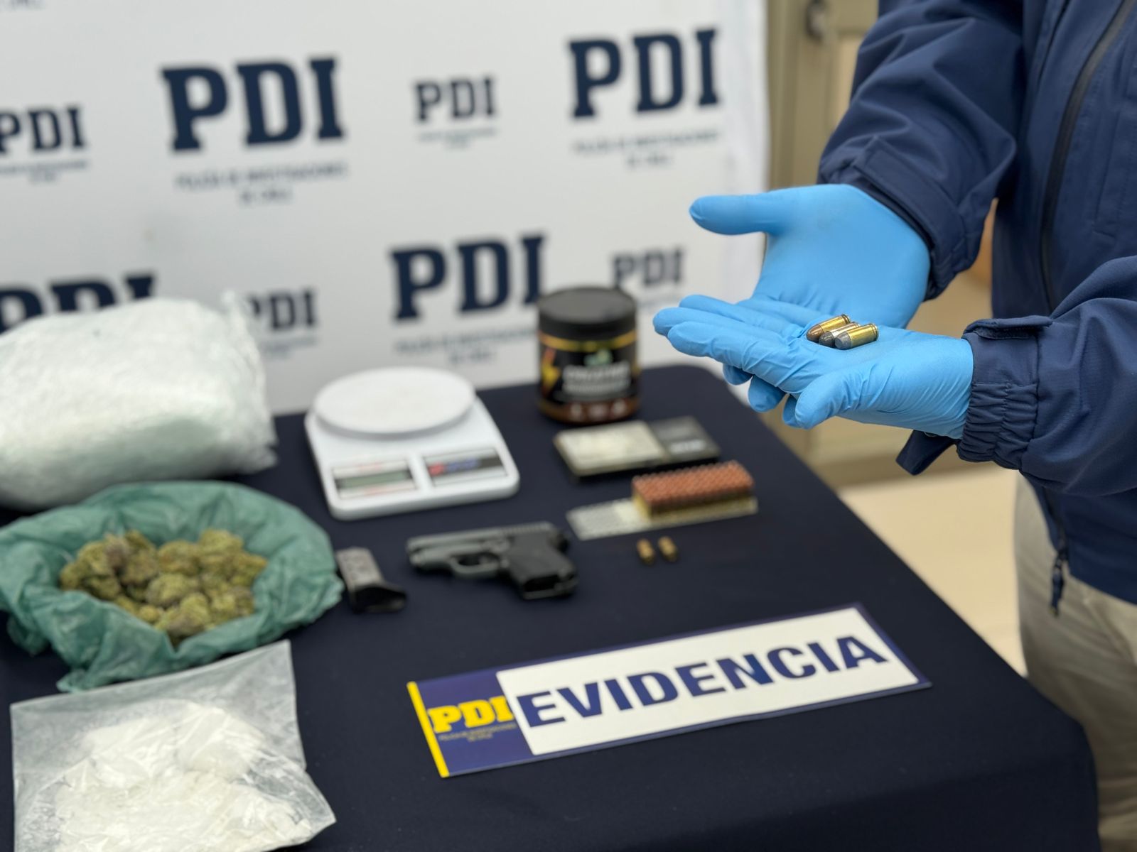 Es así como en la localidad de Chonchi se llevó a cabo un allanamiento en el domicilio del imputado, incautando cannabis, clorhidrato de cocaína, elementos de abultamiento de la droga, un arma de fuego tipo pistola, 70 cartuchos de diferente calibre y una camioneta marca Nissan.
