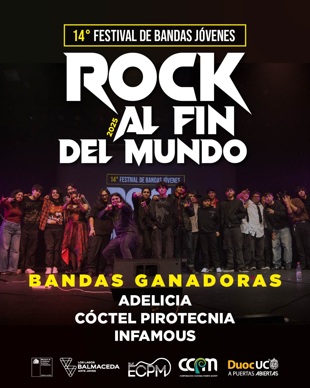 Este martes 02 de septiembre, el Teatro Diego Rivera fue escenario de la final del 14° Festival Rock al Fin del Mundo, certamen organizado por Balmaceda Arte Joven Los Lagos en colaboración con DUOC UC: Puertas Abiertas, y que reunió a jóvenes músicos del sur de Chile en torno a la creación y la interpretación en vivo.