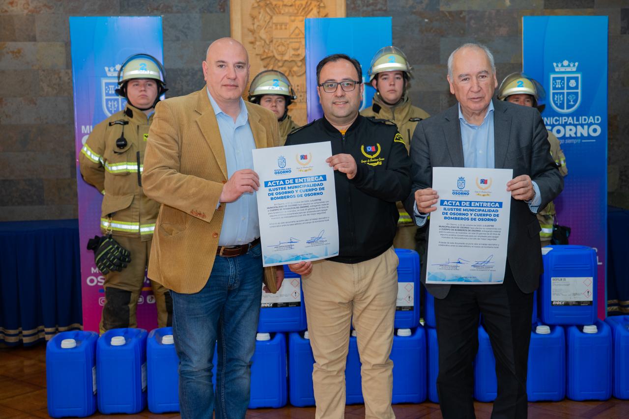 Evitar la propagación de incendios ocasionados por elementos combustibles es el objetivo de los 25 galones de espuma sintética concentrada, de 20 litros cada uno, que fue entregada por el municipio de Osorno al Cuerpo de Bomberos de la ciudad, en un acto realizado en Sala de Sesiones.