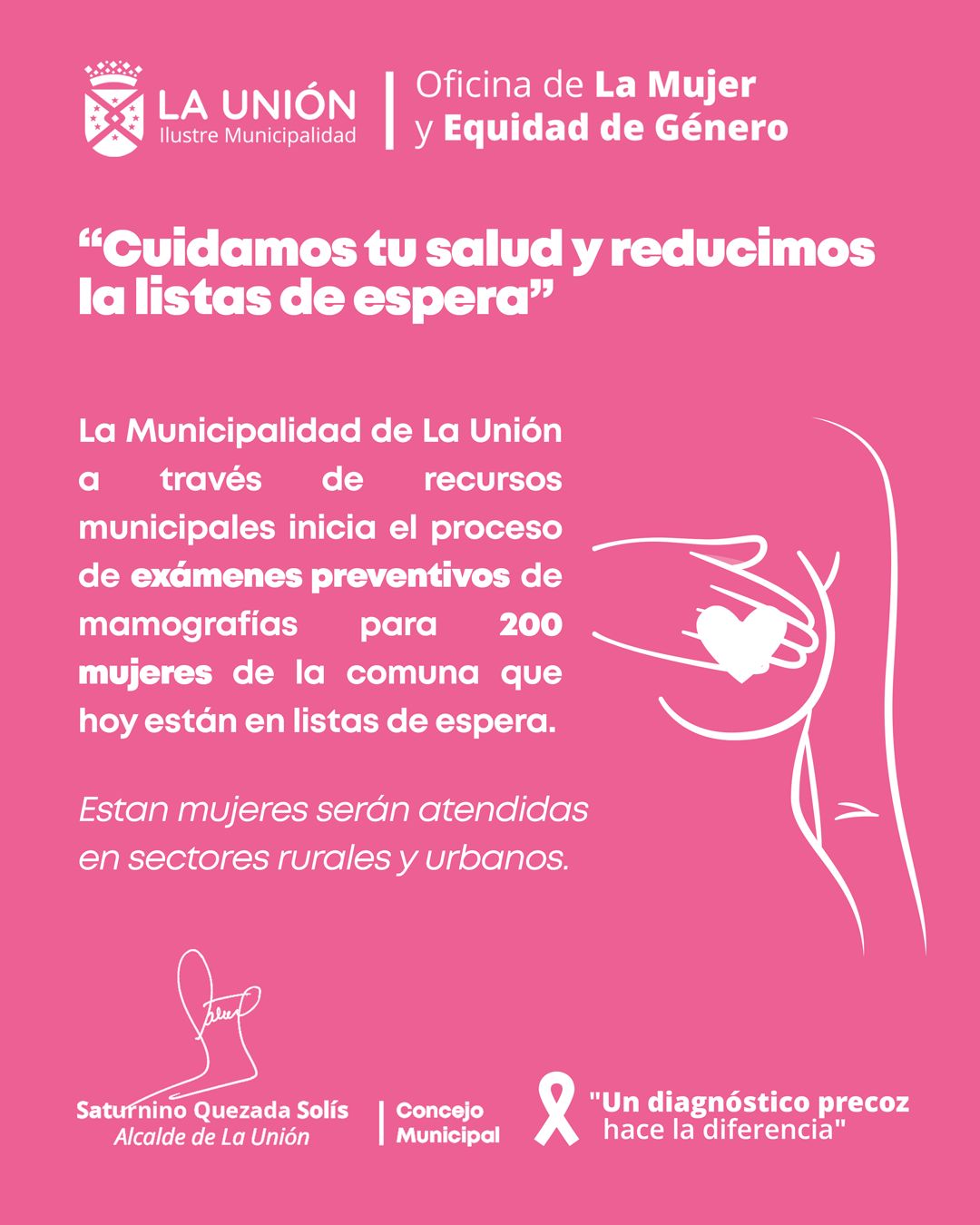 La Municipalidad de La Unión, a través de la Oficina de la Mujer y Equidad de Género, iniciará un importante operativo que permitirá reducir las listas de espera de mamografías en mujeres de la comuna, contribuyendo así a la detección temprana y prevención del cáncer de mama.