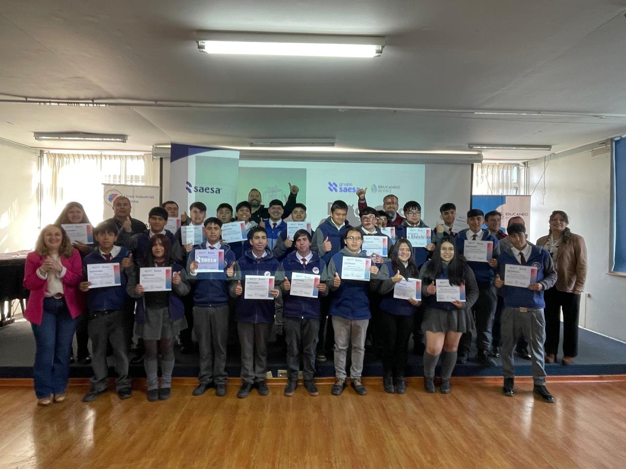 Con gran entusiasmo se realizó la ceremonia de certificación de la capacitación “Fundamentos y Aplicaciones de Redes Eléctricas”, dirigida a estudiantes de cuarto medio del Liceo Industrial de Osorno. Esta instancia forma parte del Semillero de Talentos Eléctricos, una estrategia del Programa de Liceos Eléctricos que Grupo Saesa implementa hace más de 12 años para fortalecer competencias básicas, genéricas y específicas en jóvenes que estudian la especialidad de electricidad.