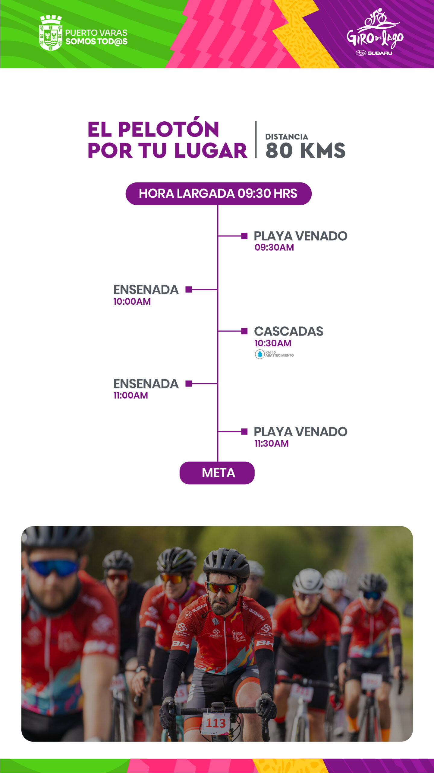 Es por ello que invitamos a todas las vecinas y vecinos de la Cuenca del Lago Llanquihue a acompañar y alentar el paso de los pelotones por sus localidades, siguiendo los horarios estimados publicados en el programa oficial.