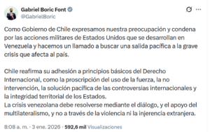 El presidente de Chile, Gabriel Boric, se pronunció públicamente este sabado frente a los recientes hechos ocurridos en Venezuela, manifestando la preocupación y condena del Gobierno de Chile ante las acciones militares atribuidas a Estados Unidos.