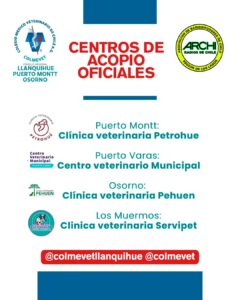 En la Región de Los Lagos, el Colegio Médico Veterinario Llanquihue, Osorno y Puerto Montt ha dispuesto cuatro puntos de acopio para recibir insumos médicos que permitan brindar atención a las mascotas y animales afectados. Estos son: la Clínica Veterinaria Petrohué de Puerto Montt; el Centro Veterinario Municipal de Puerto Varas; la Clínica Veterinaria Pehuén de Osorno y la Clínica Veterinaria Servipet de Los Muermos.