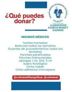 En la región de Los Lagos, la campaña del Colmevet Llanquihue, Osorno y Puerto Montt cuenta con el apoyo del Décimo Comité de la Asociación de Radiodifusores de Chile, para la promoción y difusión de los centros de acopio e insumos que se están recolectando en beneficio de los animales damnificados por los incendios forestales que han afectado las regiones del Ñuble, Biobío y La Araucanía.