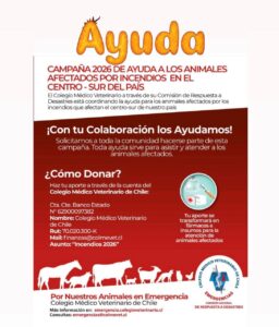 Los incendios forestales en el centro – sur de Chile no solo han dejado a miles de familias damnificadas, sino que también muchas mascotas, animales de granja y fauna silvestre se han visto afectadas, sufriendo quemaduras y heridas de diversa consideración, producto de la violencia del fuego. Por ello, a nivel nacional, el Colegio Médico Veterinario de Chile (Colmevet), a través de su Comisión Nacional de Respuesta a Desastres (CNRD), dio inicio a la campaña de donación de recursos para ir en ayuda de quienes no pueden expresar con palabras su dolor.